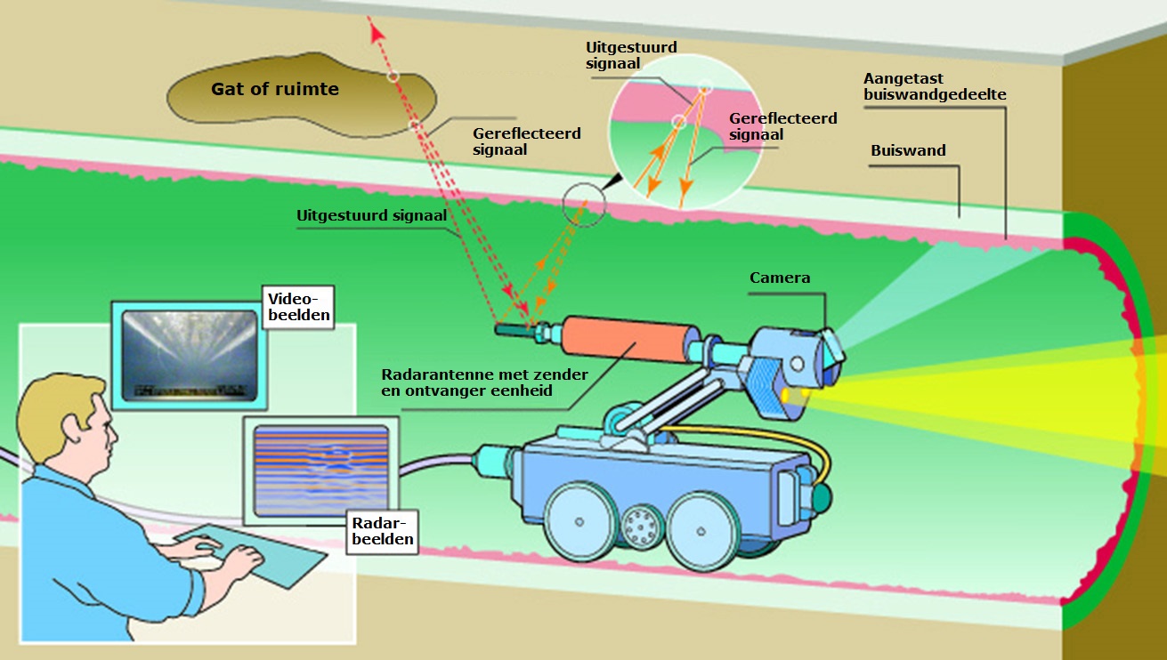 In het verlengde van onze leidinginspectie met behulp van camera's, is een meetmethodiek ontwikkeld om gelijktijdig met de reguliere camera-inspectie de kwaliteit van de buiswand te kunnen bepalen. Dit doen we met behulp van radartechnologie. Met deze ‘rioolradar' kan bij ongewapende betonnen buizen de resterende wanddikte en de resterende druksterkte bepaald worden.