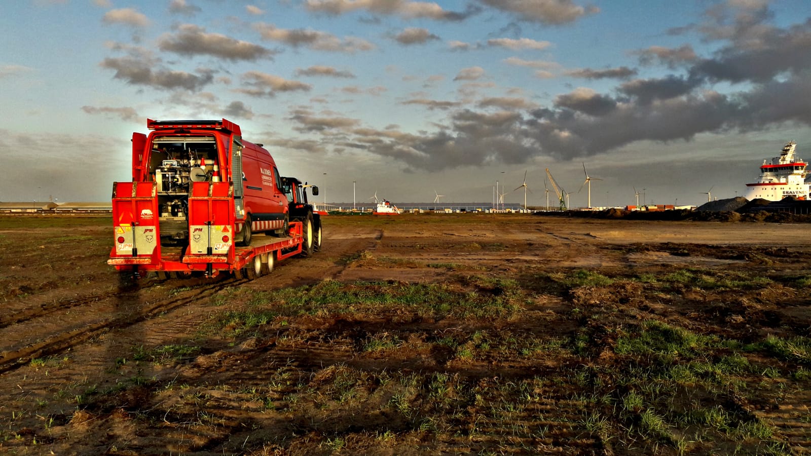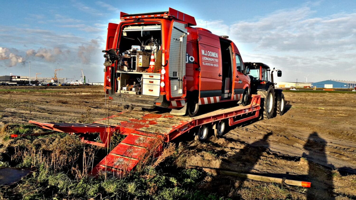M.J. Oomen Moerdijk voert in Vlissingen leidinginspecties uit rondom het havengebied. Dat vraagt creativiteit en inventiviteit. Sommige van de inspectieputten zijn namelijk lastig bereikbaar vanwege het drassige terrein eromheen. Zodoende is besloten om de gehele inspectie-unit op een oplegger te rijden om zo bij de putten te komen. Eenmaal bij de put aangekomen wordt de put vanaf de oplegger geïnspecteerd.