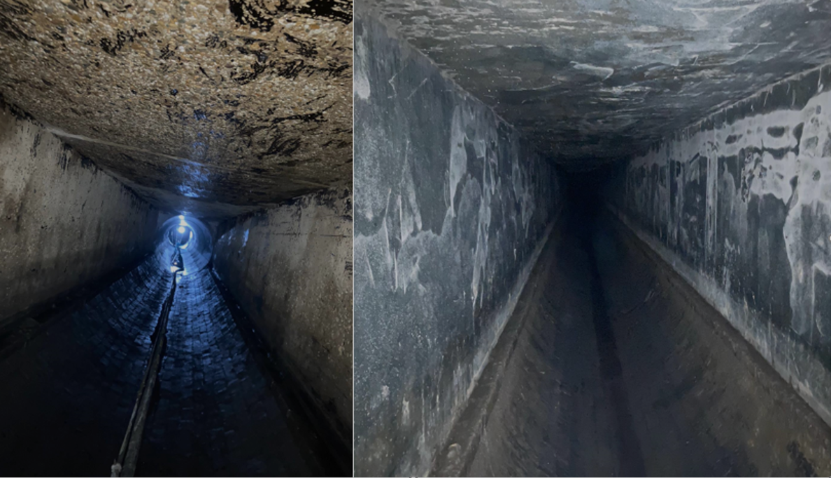 Het doel van dit project, is een betere afwatering van het afvalwater uit Breda. De influentleiding die aangepakt wordt, komt namelijk direct uit op de waterzuivering van het Waterschap in Breda. In 2013 is de leiding al geïnspecteerd. Door met snel hardend beton te werken zorgen we ervoor dat het riool na onze werkzaamheden zo snel mogelijk weer in gebruik genomen kan worden. Op de afbeelding hieronder is goed te zien hoe de laag wordt aangebracht op de wanden van de leiding. Op de linkse foto zie je hoe het riool is gereinigd en de aangetaste laag aan de zijkanten van de leiding is verwijderd. Daarna is zoals te zien is op de rechter foto de nieuwe betonlaag aangebracht en afgesmeerd zodat het een egale laag wordt op de leiding. Nadat deze hard is geworden vormt dit een nieuwe laag op de influentleiding. Hierdoor staat het riool weer stevig zodat het afvalwater makkelijk door kan lopen.